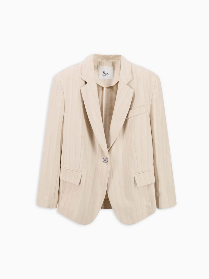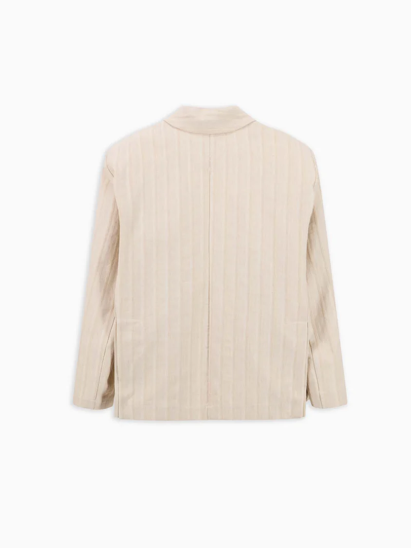 giacca oversize in tela di cotone spigato, chiusura centrale con bottone in metallo, spacchi laterali, due tasche con patta sul davanti e una tasca a filetto nella parte superiore.