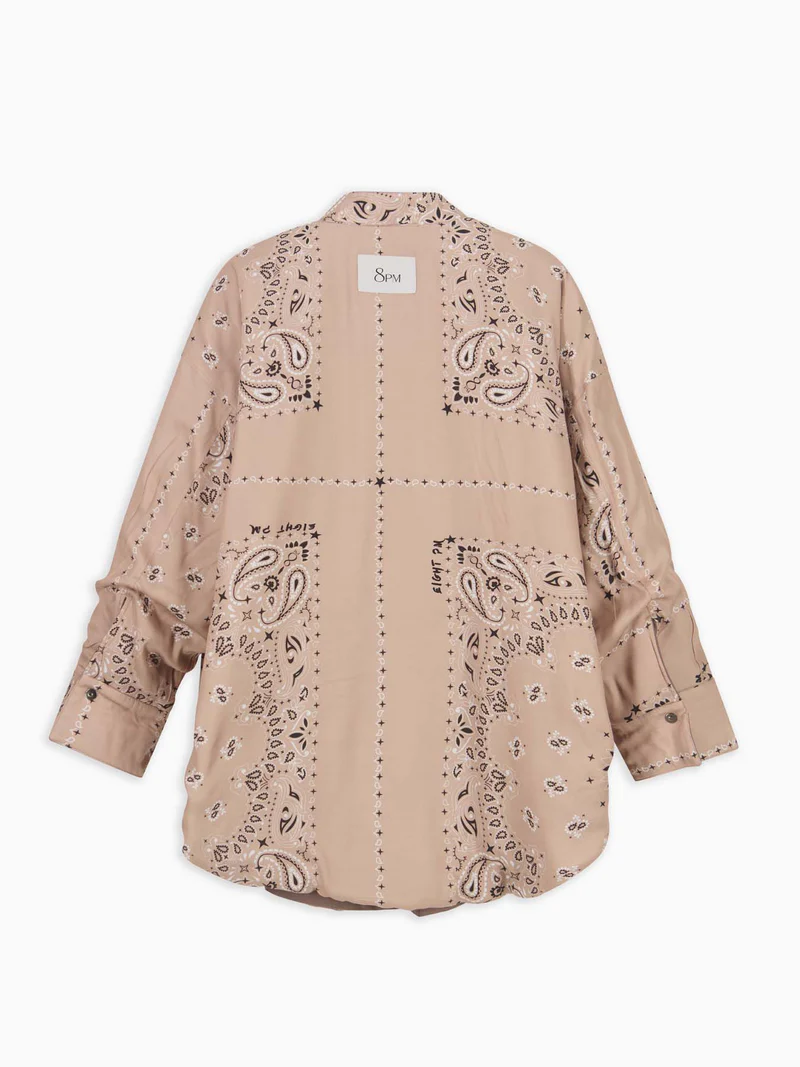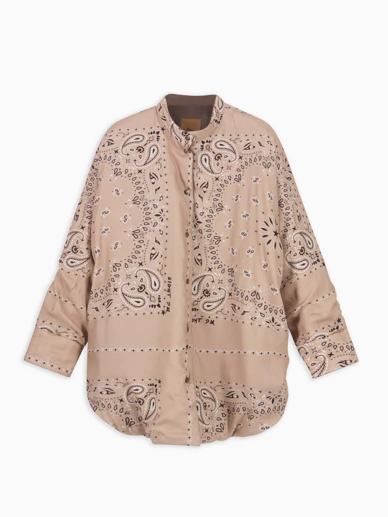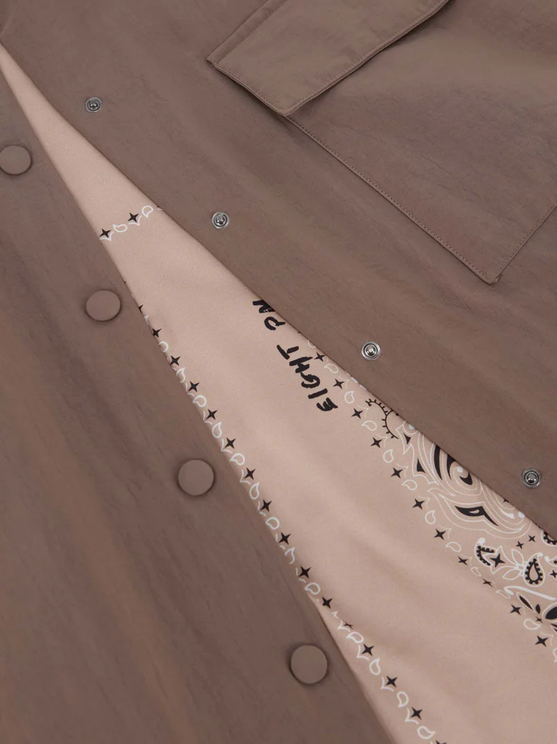 giacca camicia imbottita reversibile, nylon da un lato e twill di viscosa stampa bandana dall’altro, collo alla coreana, polso a camicia, tasca applicata sul davanti, chiusura centrale con bottoni a pressione, tag con logo nella parte posteriore, vestibilità over