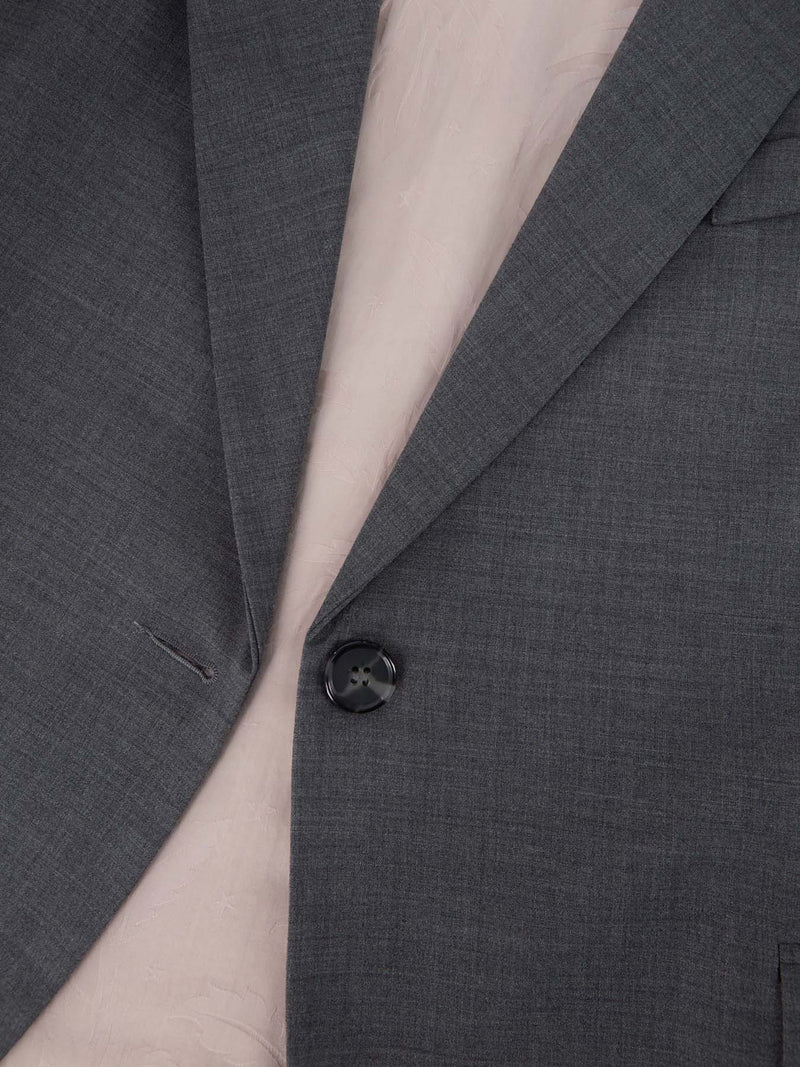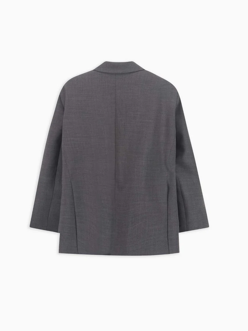 giacca oversize in fresco di lana, spalline leggermente imbottite, chiusura centrale monopetto con bottone effetto corno, due spacchi posteriori, due tasche frontali a filetto con patta, una tasca a filetto superiore, fodera interna jacquard