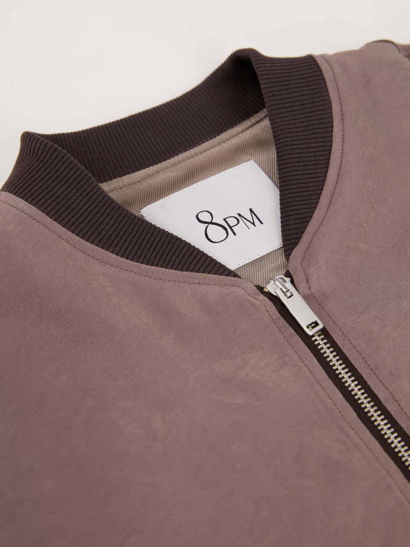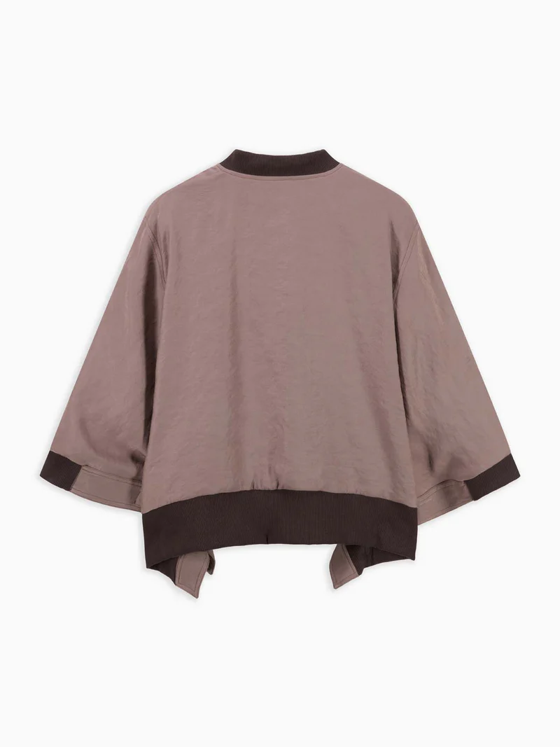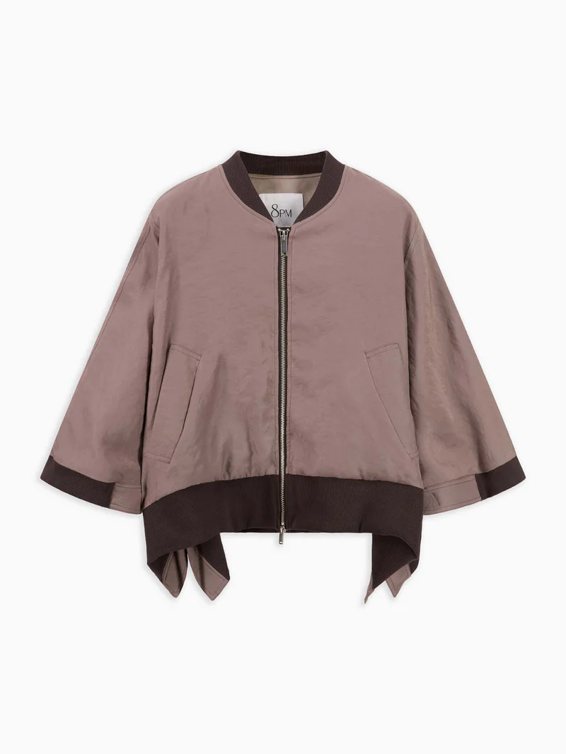 bomber a kimono in viscosa lucida, costina nei bordi, chiusura centrale con zip, due tasche a filetto sul davanti, maniche lunghezza tre quarti