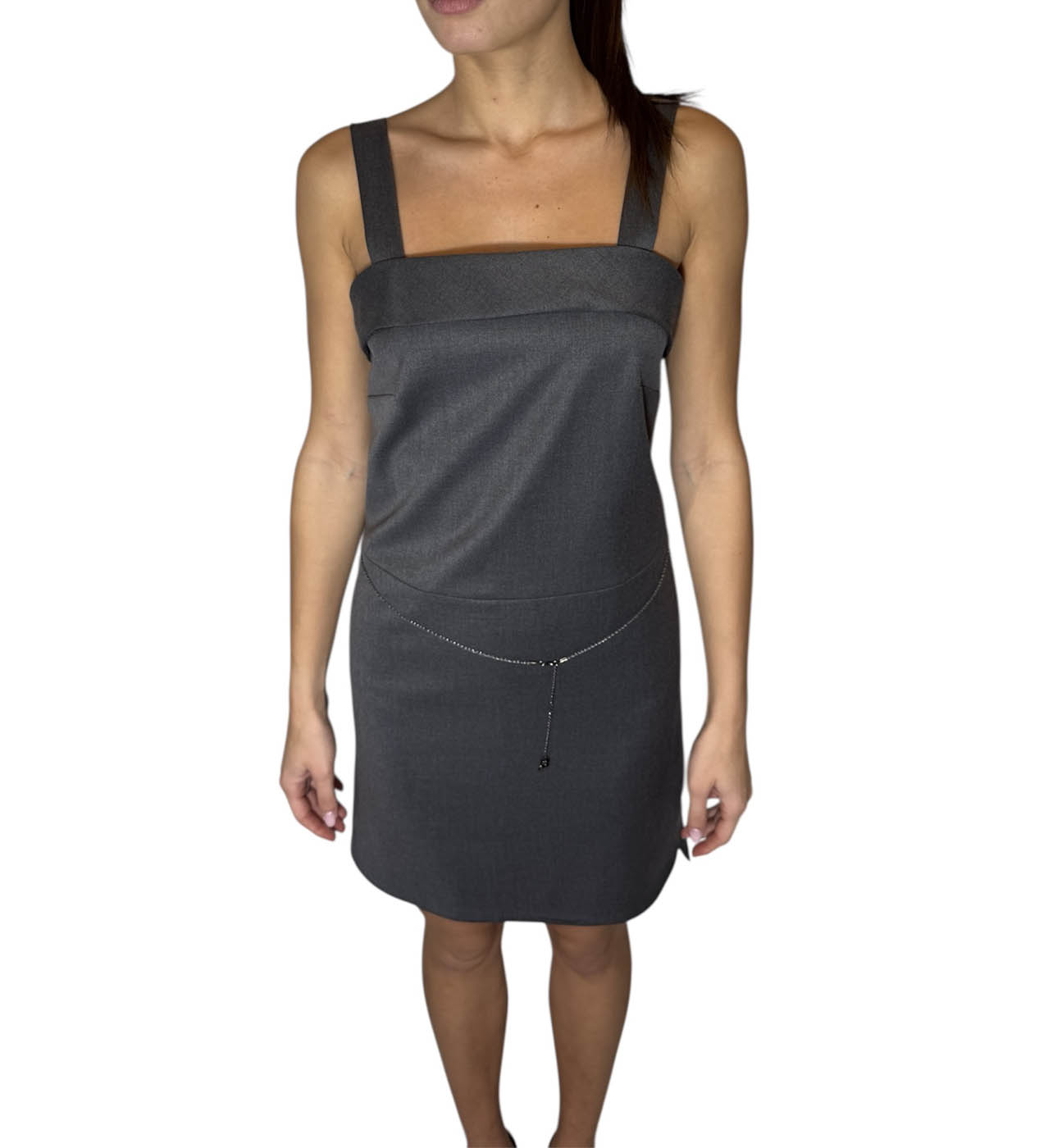 Abito corto grigio, con bretelle spesse, cerniera sul retro e cintura sottile