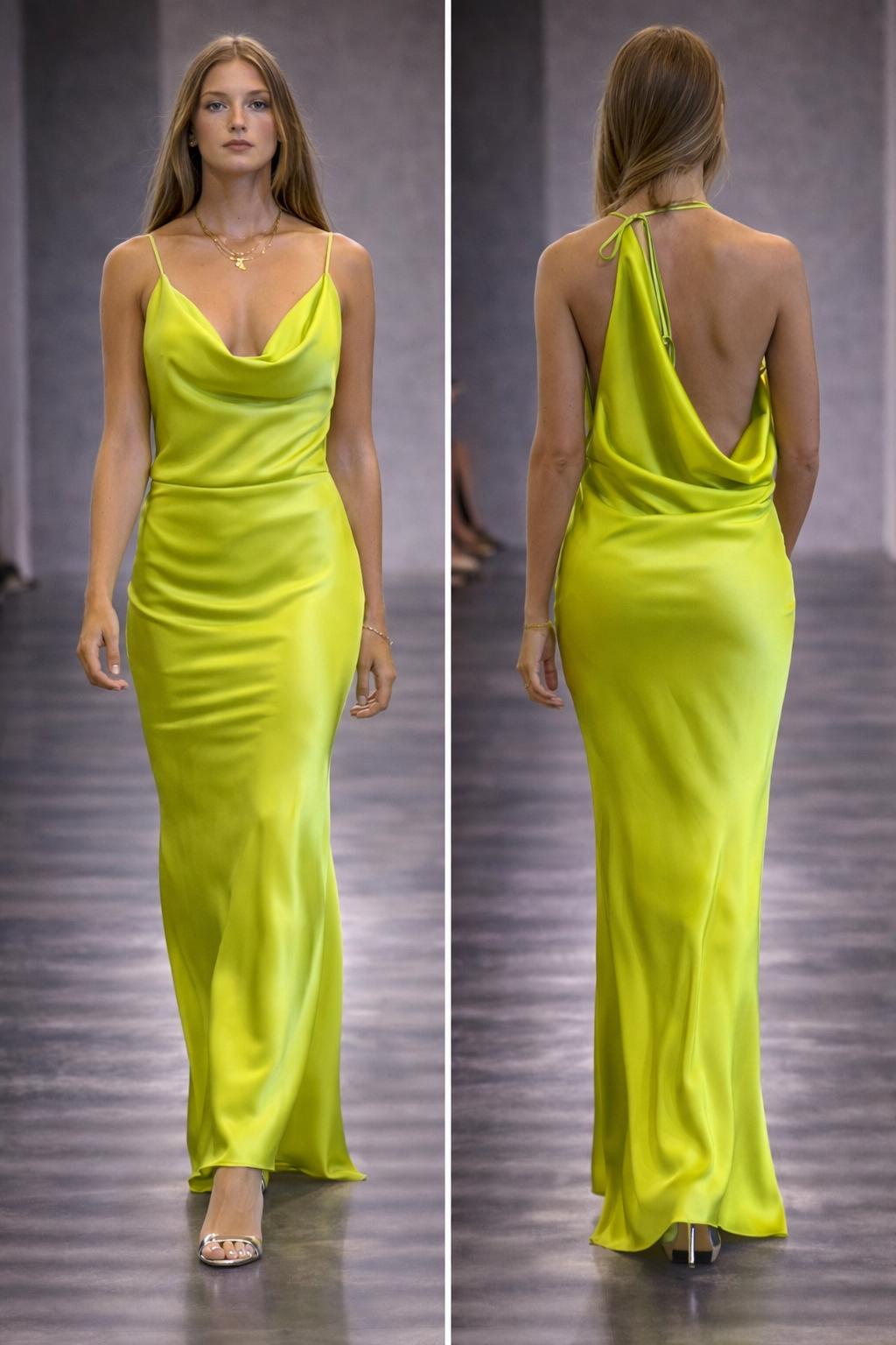 Abito lime, lungo con scollo, schiena semi scoperta con drappeggio legato dietro il collo, cerniera sul fianco.