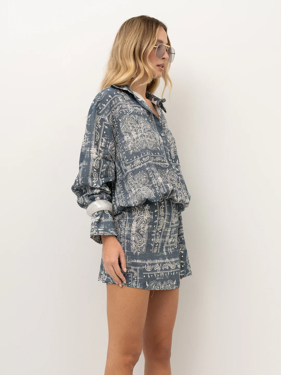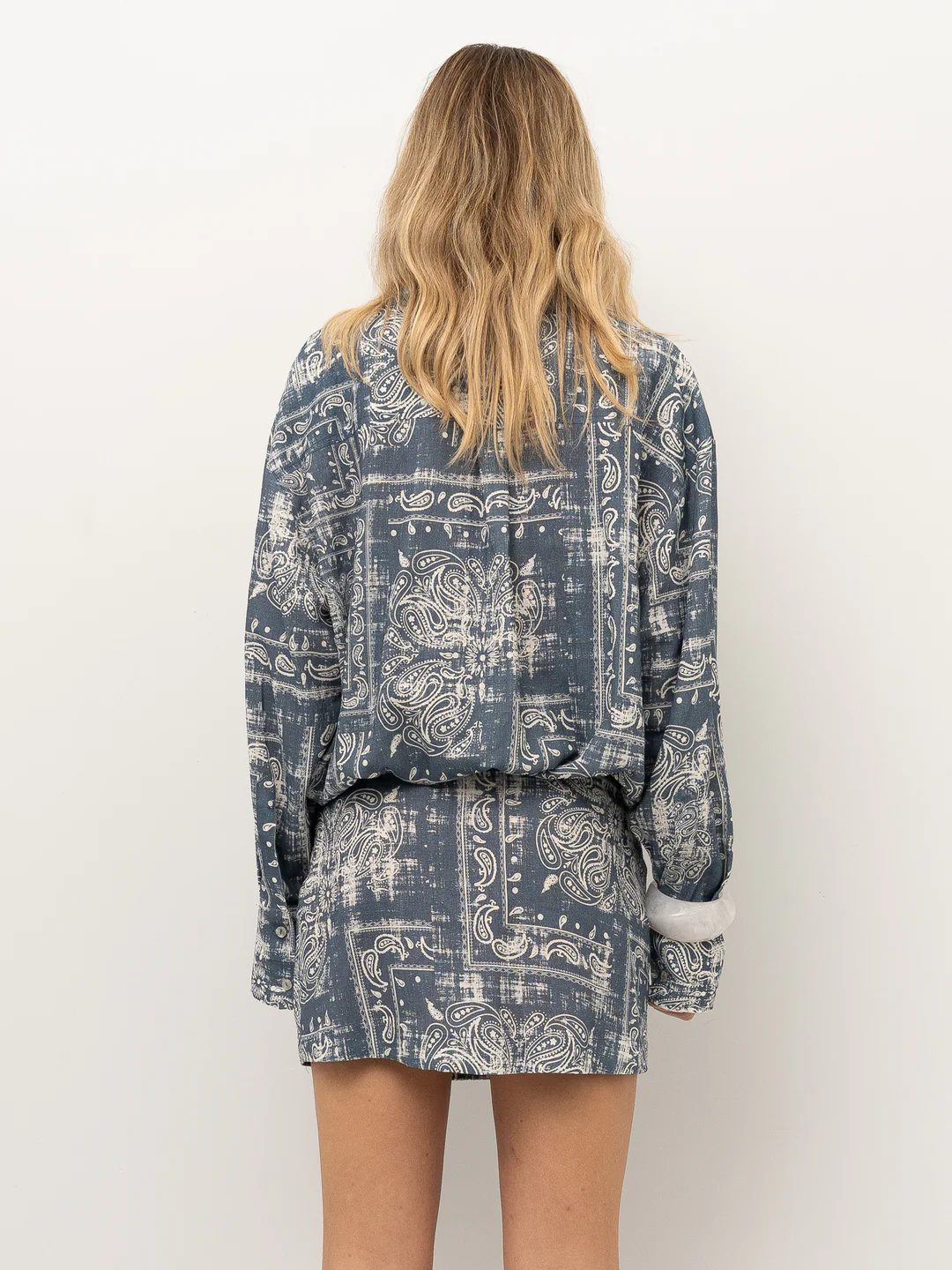 dettagli: fantasia paisley all over, maniche lunghe con polsini, abbottonatura frontale, linea dritta, fondo lineare