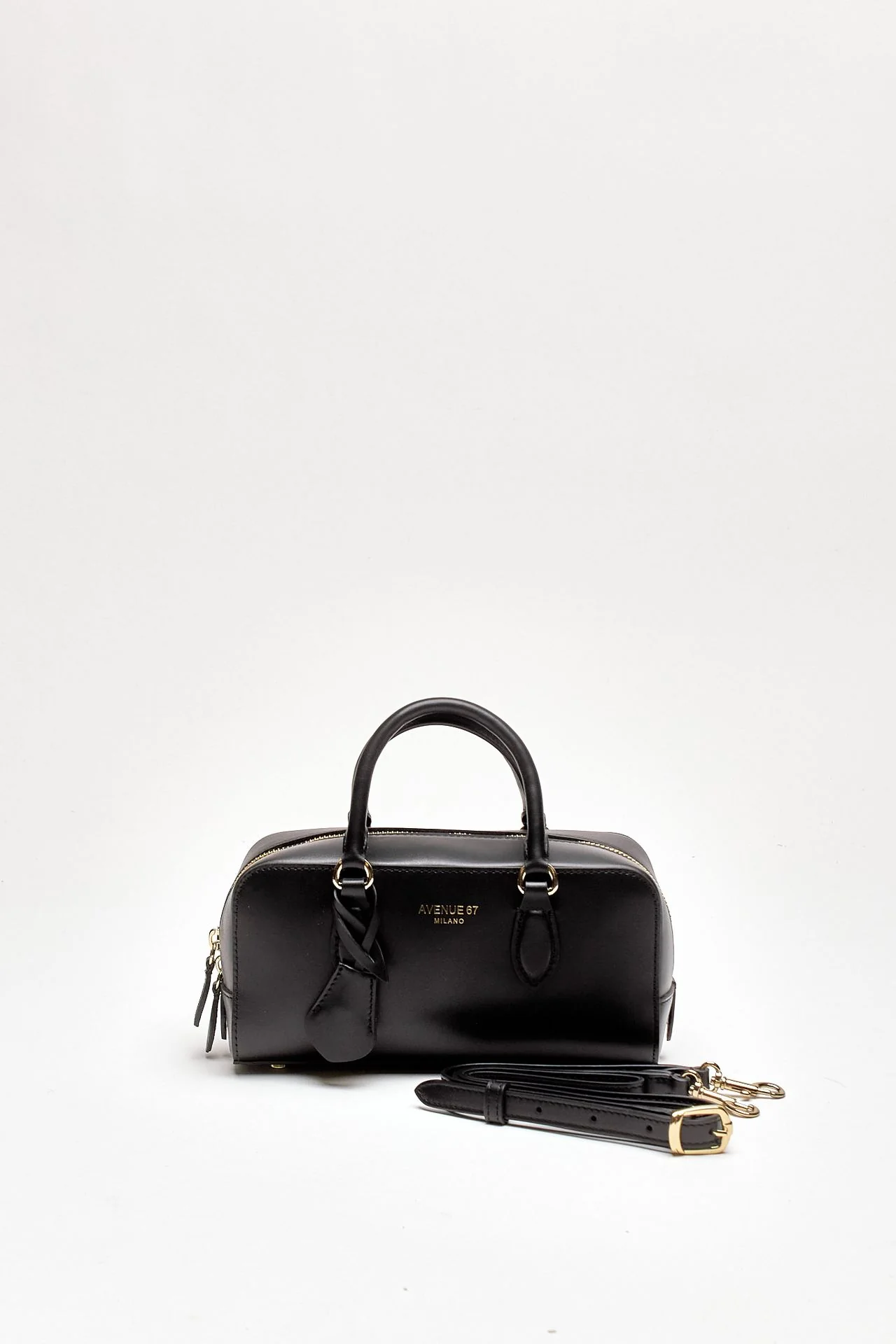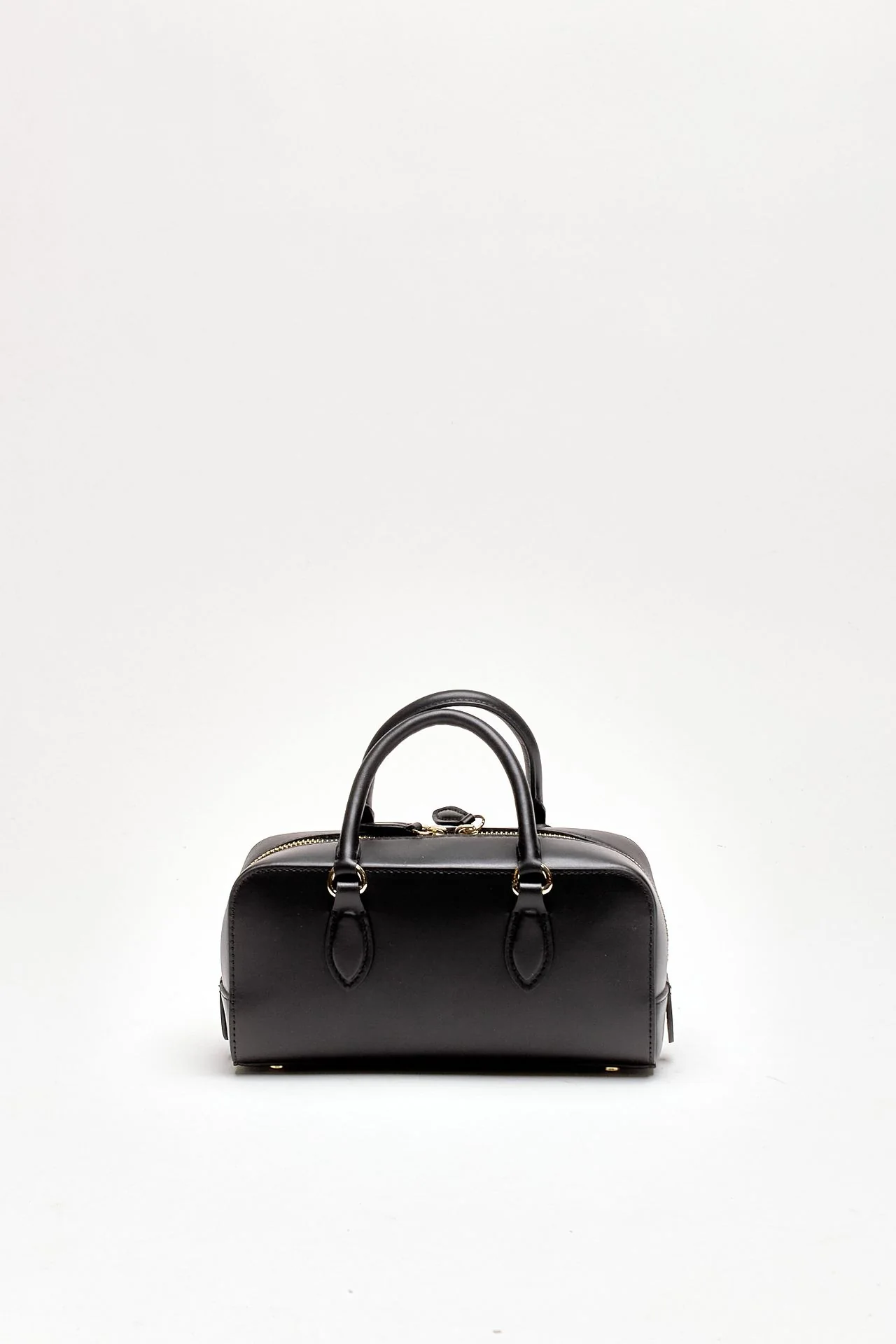 Mini-bauletto rigido, doppio manico fisso, chiusura con zip a doppio cursore, unico vano interno, tasca portaoggetti, pendaglio portachiavi, tracolla rimovibile e allungabile max cm.115.