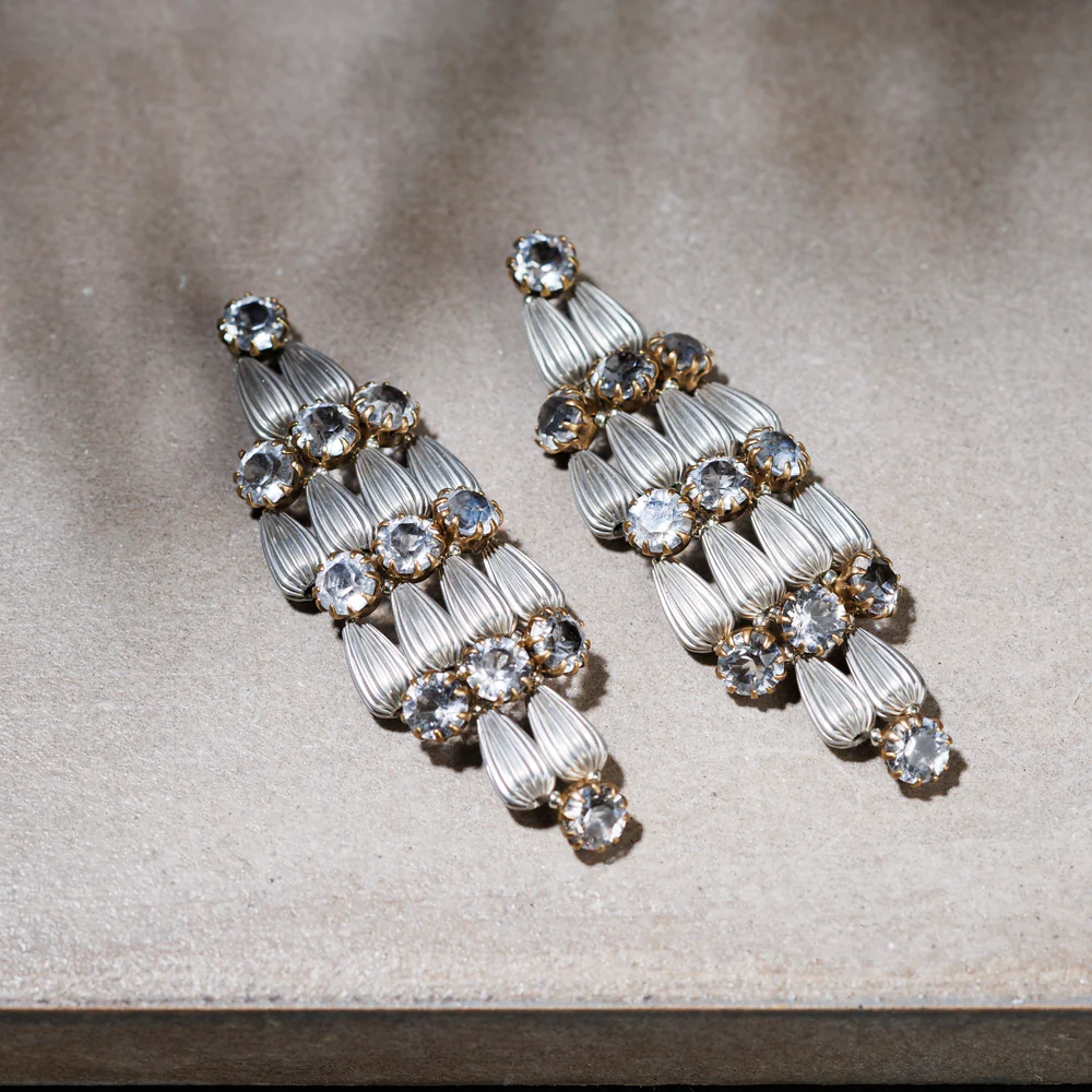 Brezza, orecchini preziosi e raffinati, caratterizzati da una simmetria di gocce metalliche completamente fuse a piccoli tondi di cristallo. Impreziositi da schegge di ematite.