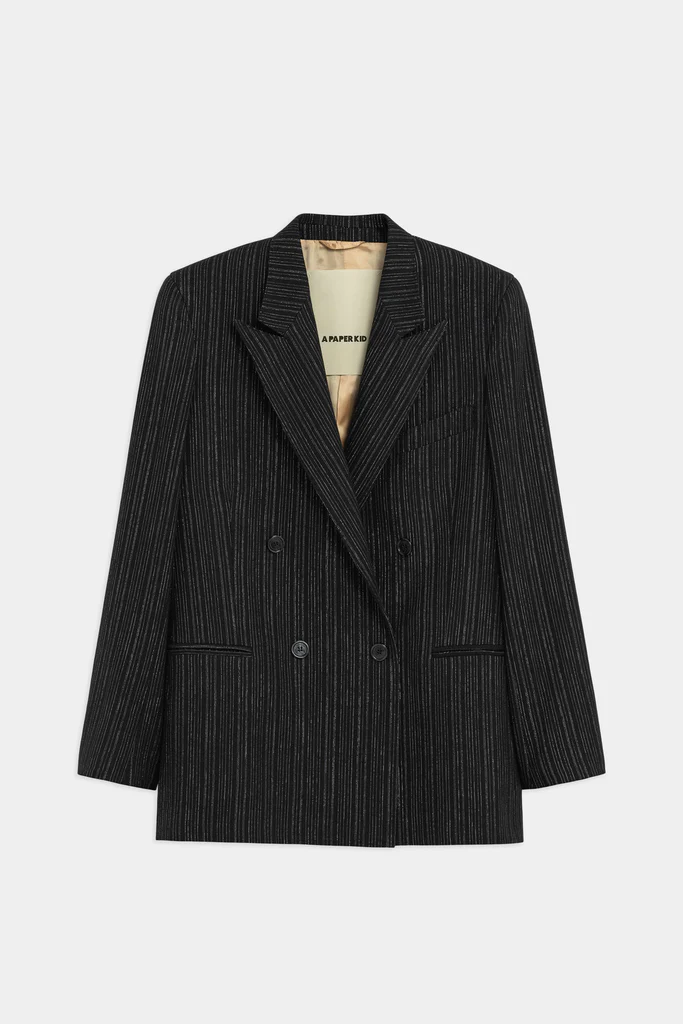 Blazer doppiopetto in tessuto gessato nero con sottili righe verticali in filo lurex. Presenta rever a lancia strutturati, taschino sul petto e tasche frontali con pattina. Chiusura frontale con bottoni tono su tono. Interno foderato con etichetta con logo. Linea dal taglio sartoriale e silhouette leggermente oversize.