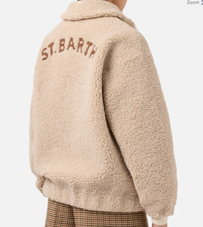Teddy bomber dal mood cozy-cool: volume over, collo camicia arrotondato e patch sul retro per un tocco statement.