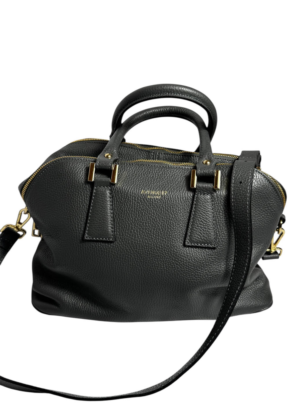 Borsa morbida media, doppio manico, doppio vano interno, doppia chiusura con zip, tasca interna con zip e doppia tasca portaoggetti, tracolla in pelle rimovibile e allungabile max cm 128.