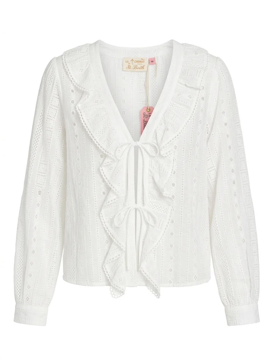 Camicia romantica in sangallo con V profonda e chiusa da laccetti