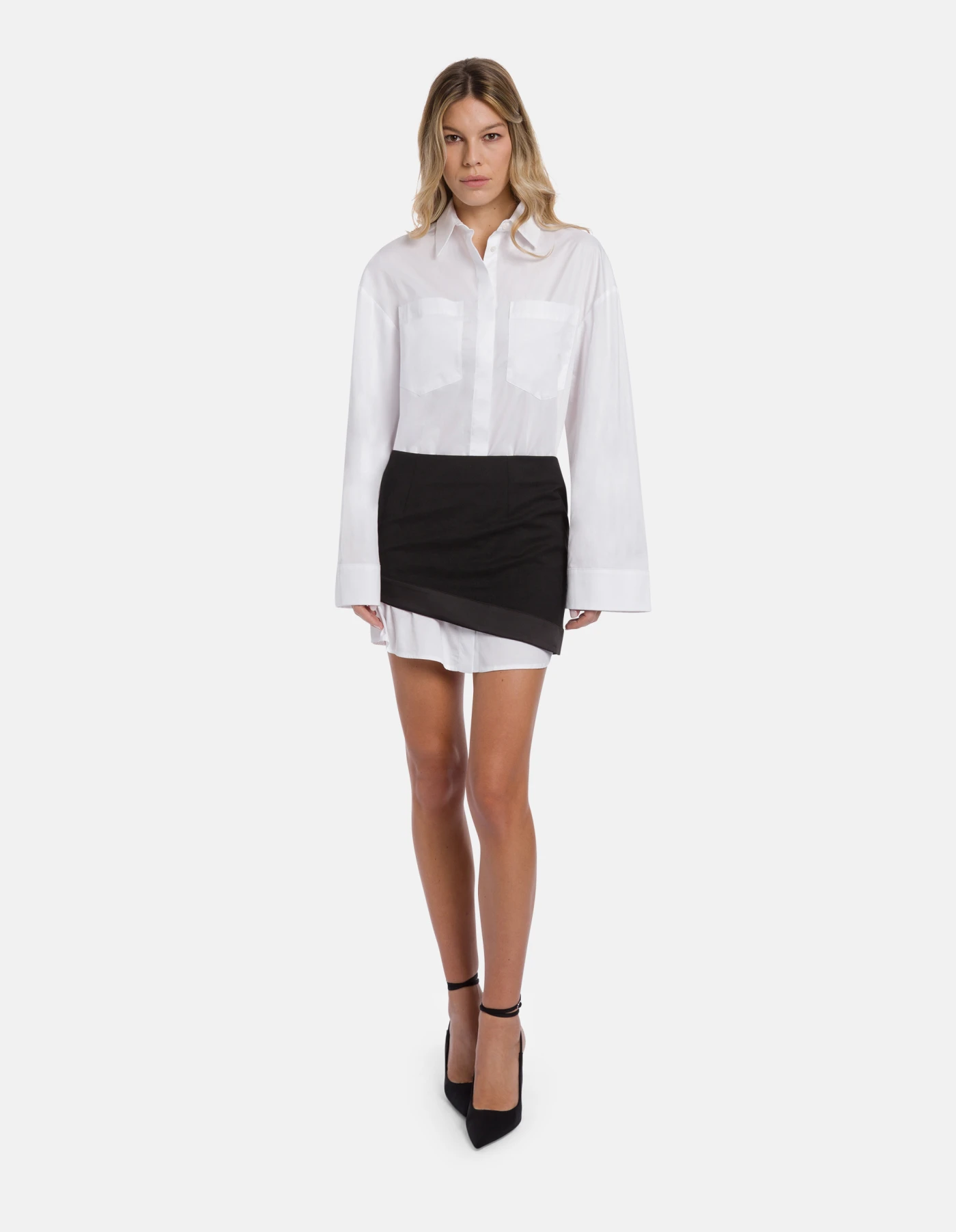 Abito corto composto da un camicione a maniche lunghe e gonna staccata con banda smoking da abbinare sopra. Gabardina tinto filo. Logo Dondup. Made in Italy