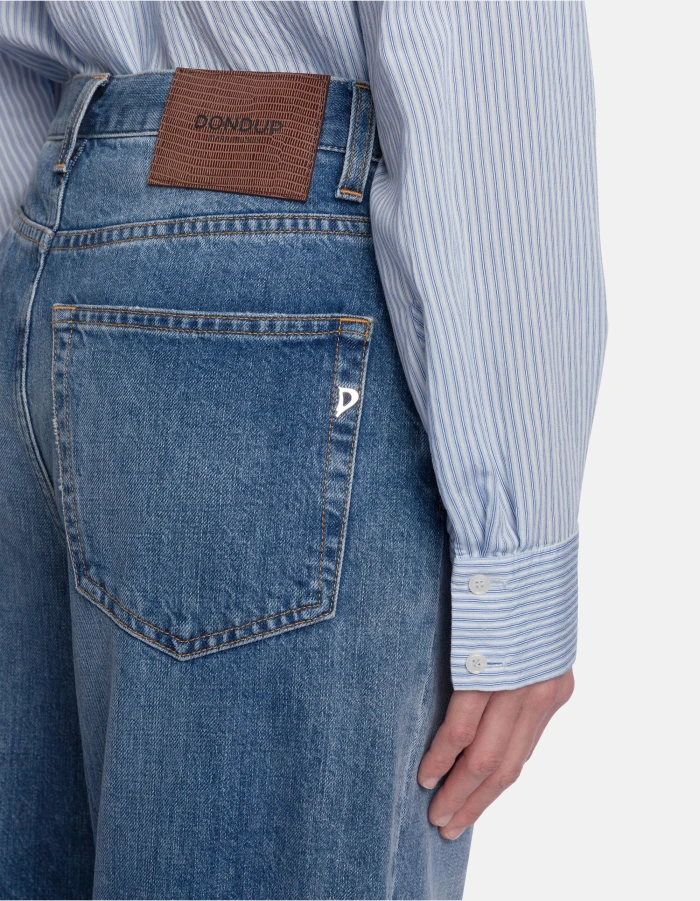 Jeans Bessie cinque tasche loose fit, vita alta. Denim fisso cross blu 12.50 oz. Lavaggio vintage medio scuro Logo Dondup. Made in Italy