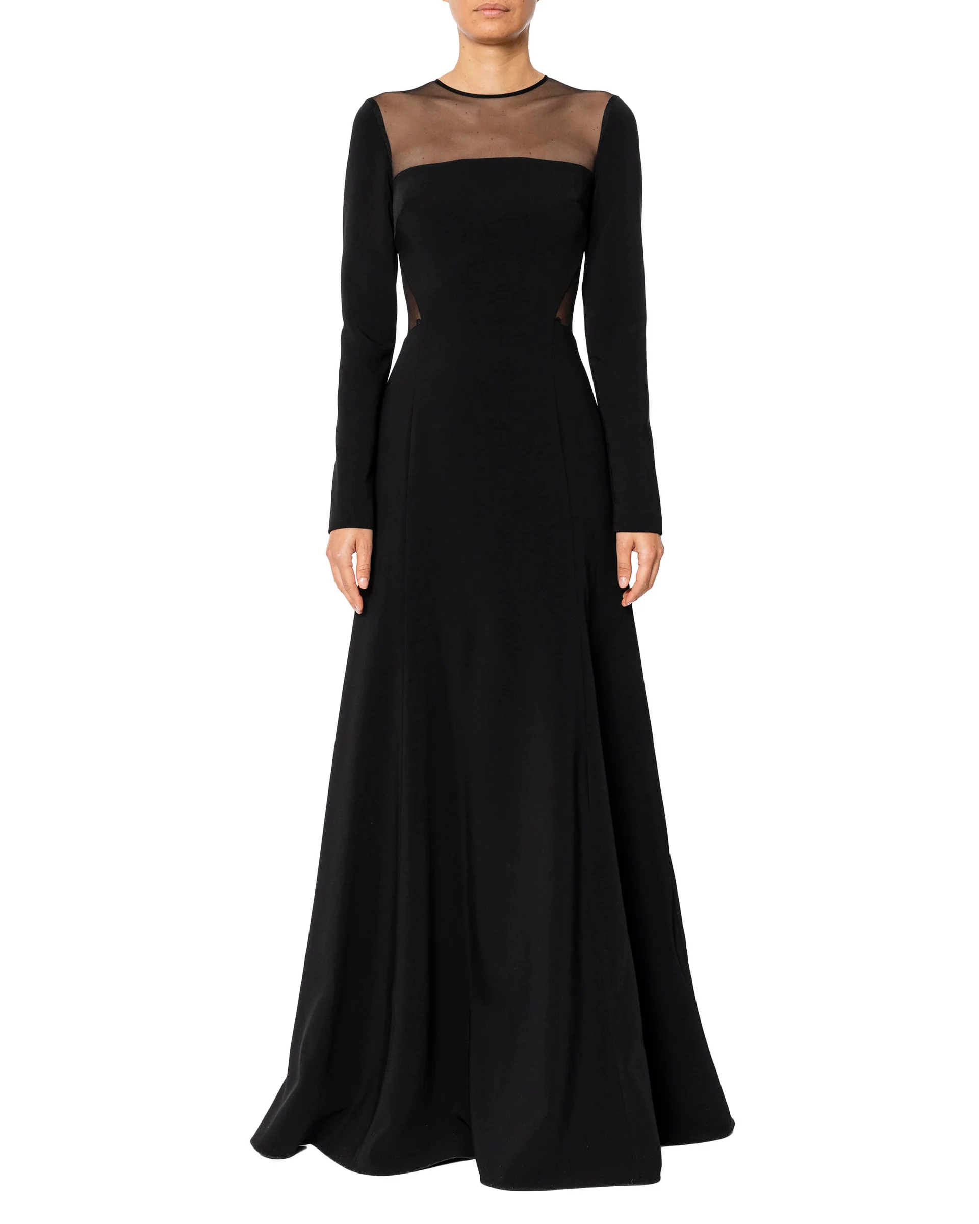 Abito lungo nero con schiena e petto in trasparenza