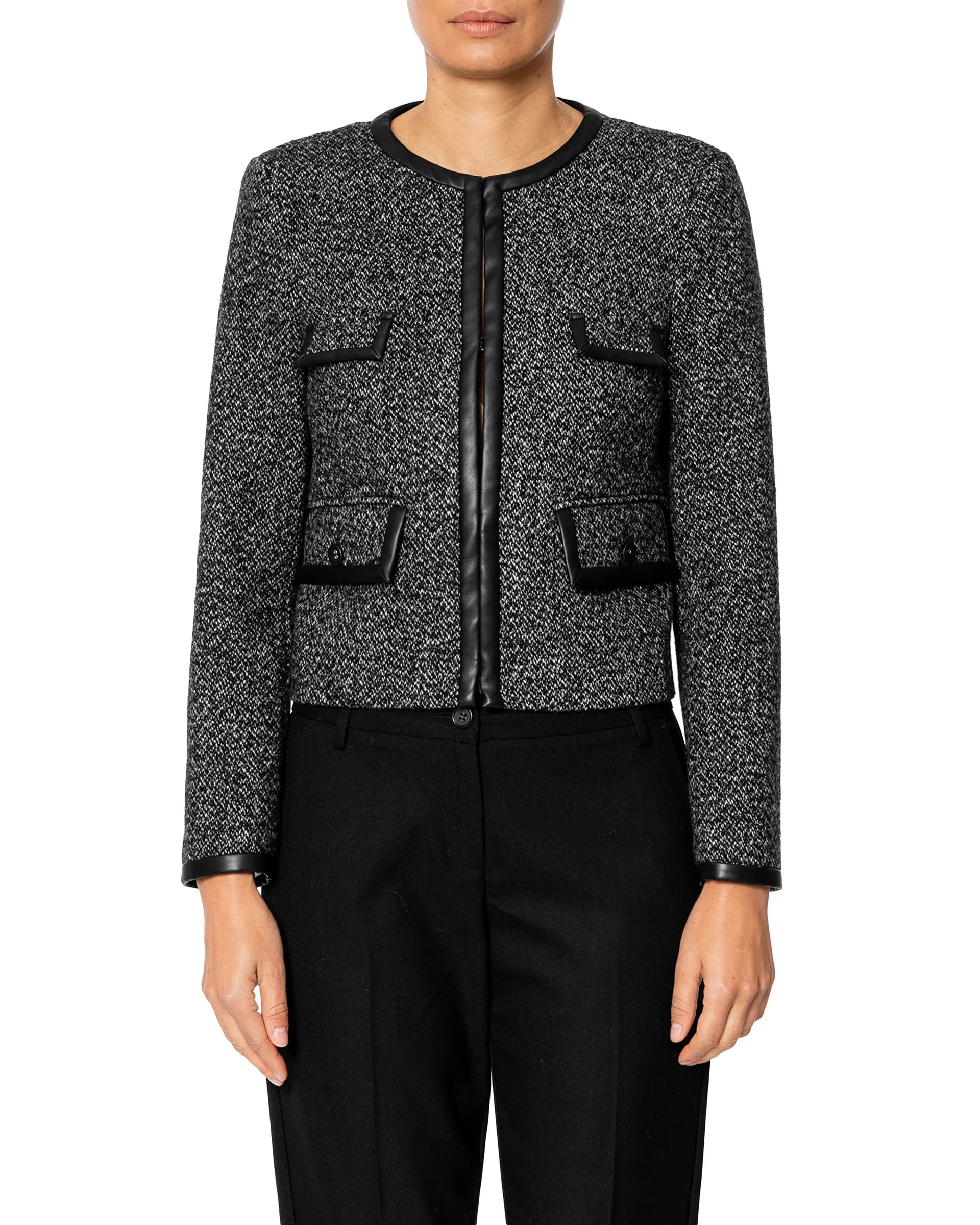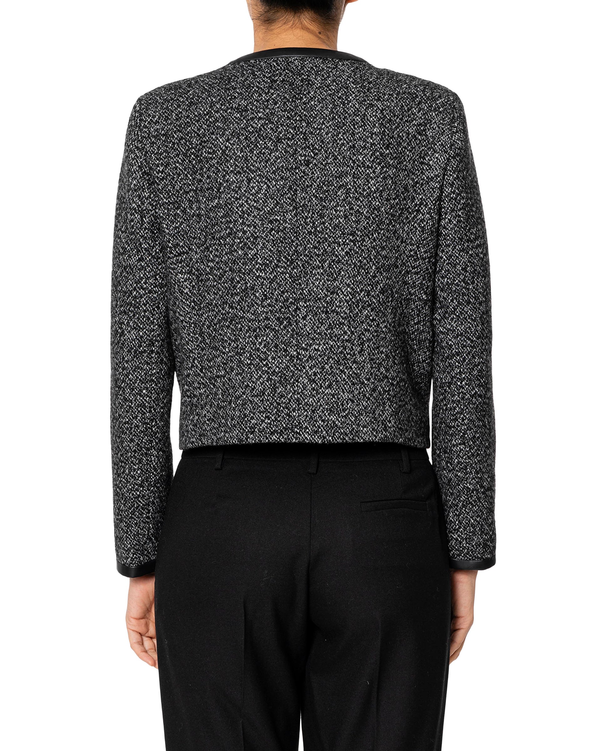 Giacca modello corto con tasche e rifiniture in pelle nero, chiusura a gancetti.