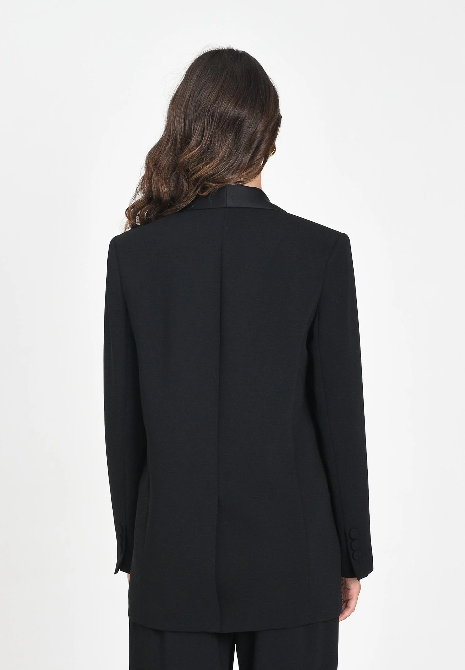 Giacca nera da donna in stile smoking con rever sciallato in raso lucido tono su tono, per un look sofisticato e dal gusto sartoriale. Il taglio è dritto e leggermente over, con chiusura anteriore invisibile che mantiene pulita la linea frontale. Presenta tasche laterali a filetto e spalle strutturate
