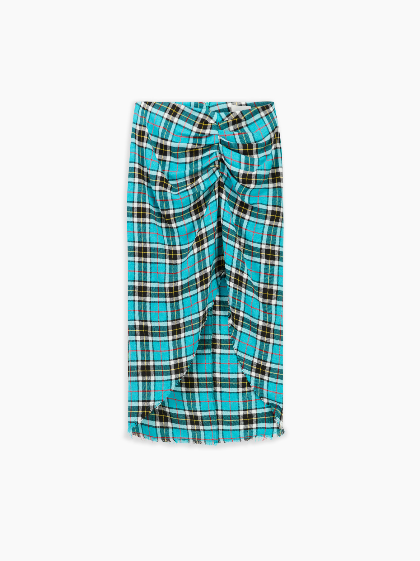 gonna midi in flanella di viscosa, spacco frontale con taglio vivo, arricciatura nella parte superiore, chiusura con zip posteriore.