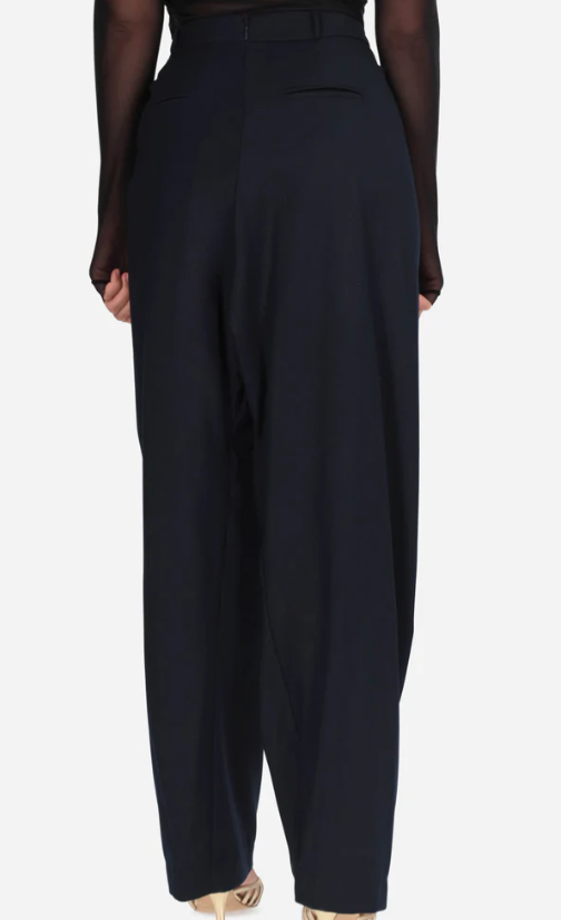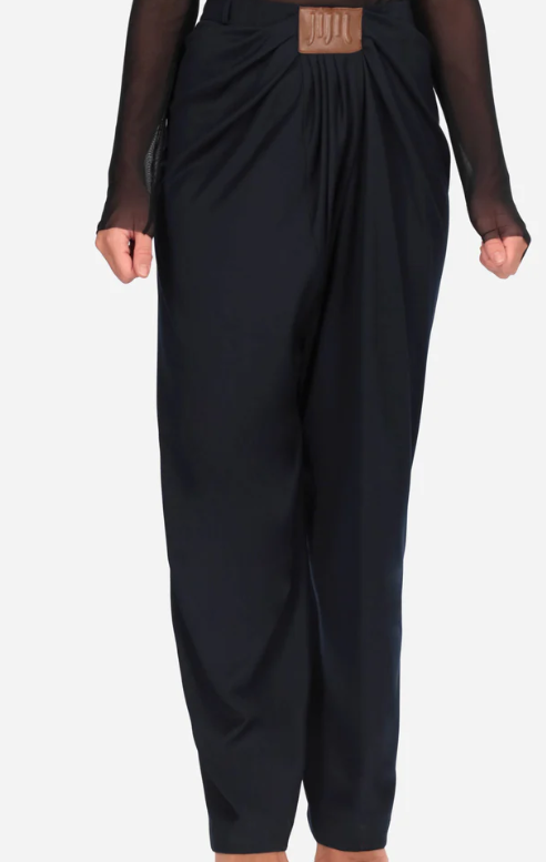 Presenta drappeggio marcato nella parte frontale creando un effetto di tessuto incrociato che conferisce volume morbidezza, patch logo sul davanti, gamba diritta che si restringe leggermente verso la caviglia, passanti in vita.