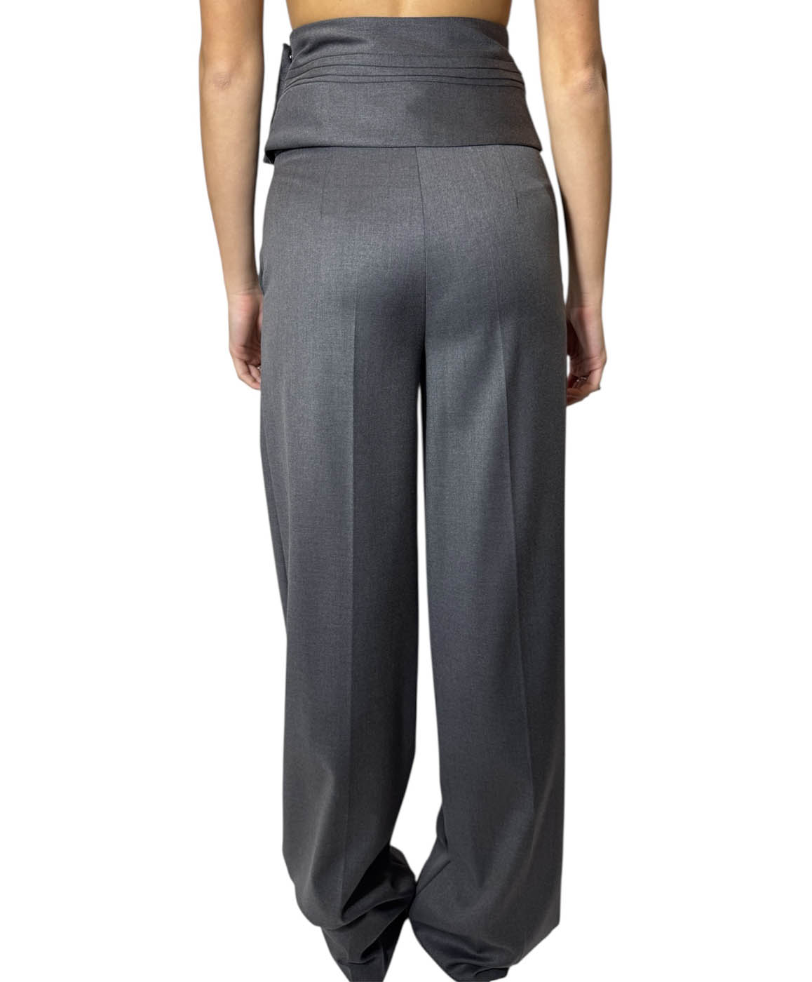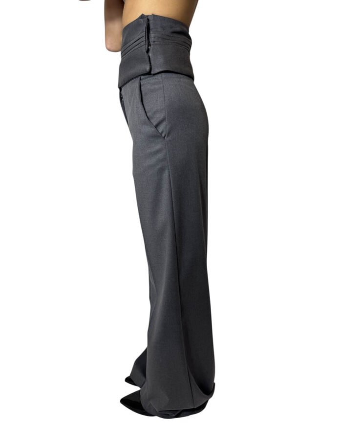 Pantalone ampio un bottone, con fusciacca staccabile.