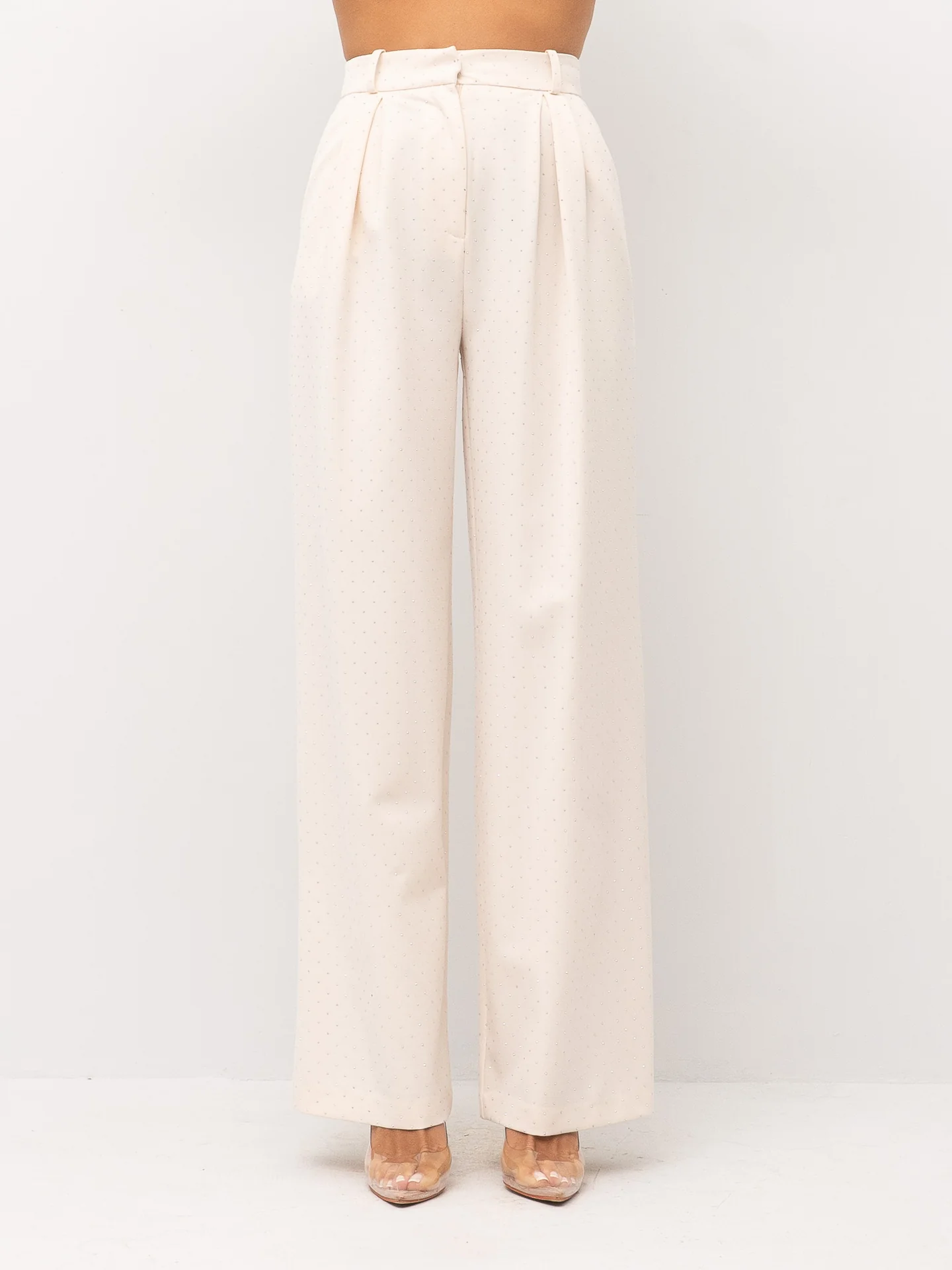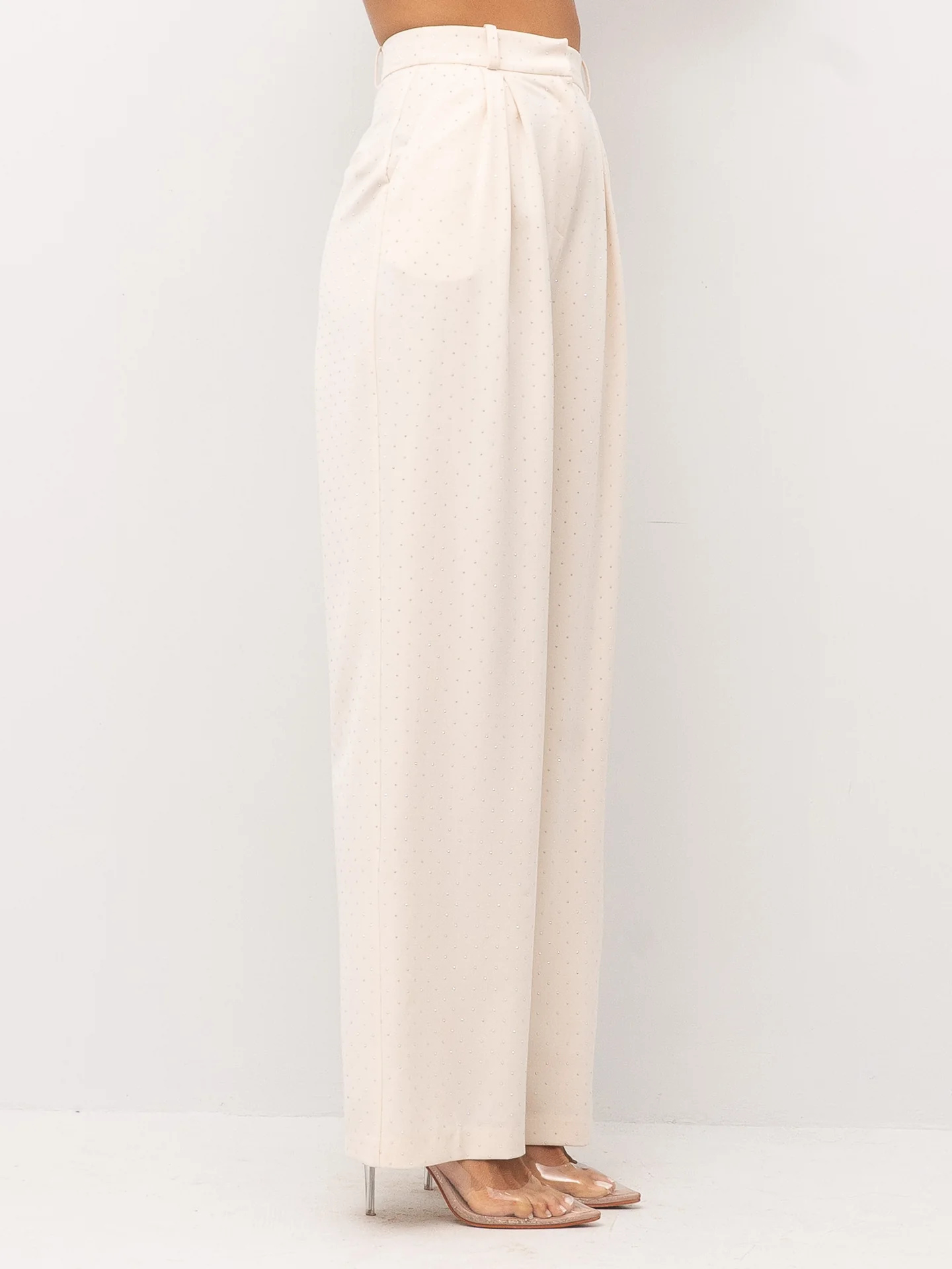 Pantalone a vita alta con passanti, pinces frontali e gamba ampia; tessuto con micro strass applicati su tutta la superficie