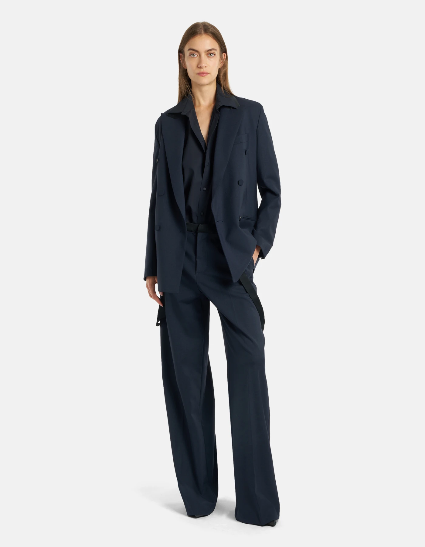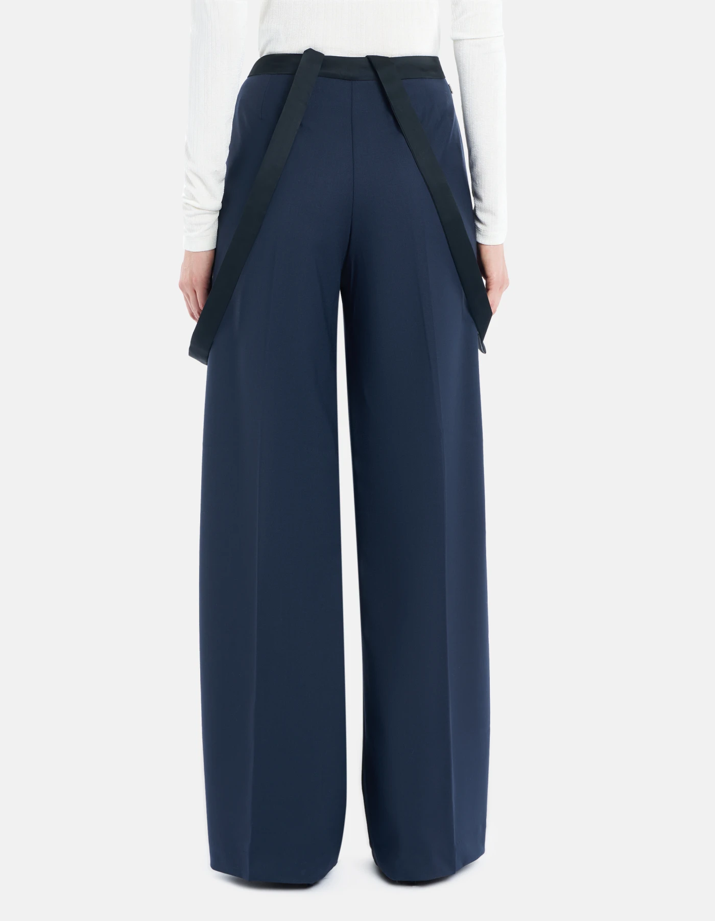 Pantalone Tecla wide leg chino a vita regolabile con bretelle removibili. Cinta e bretelle in raso. Gabardina di lana stretch.