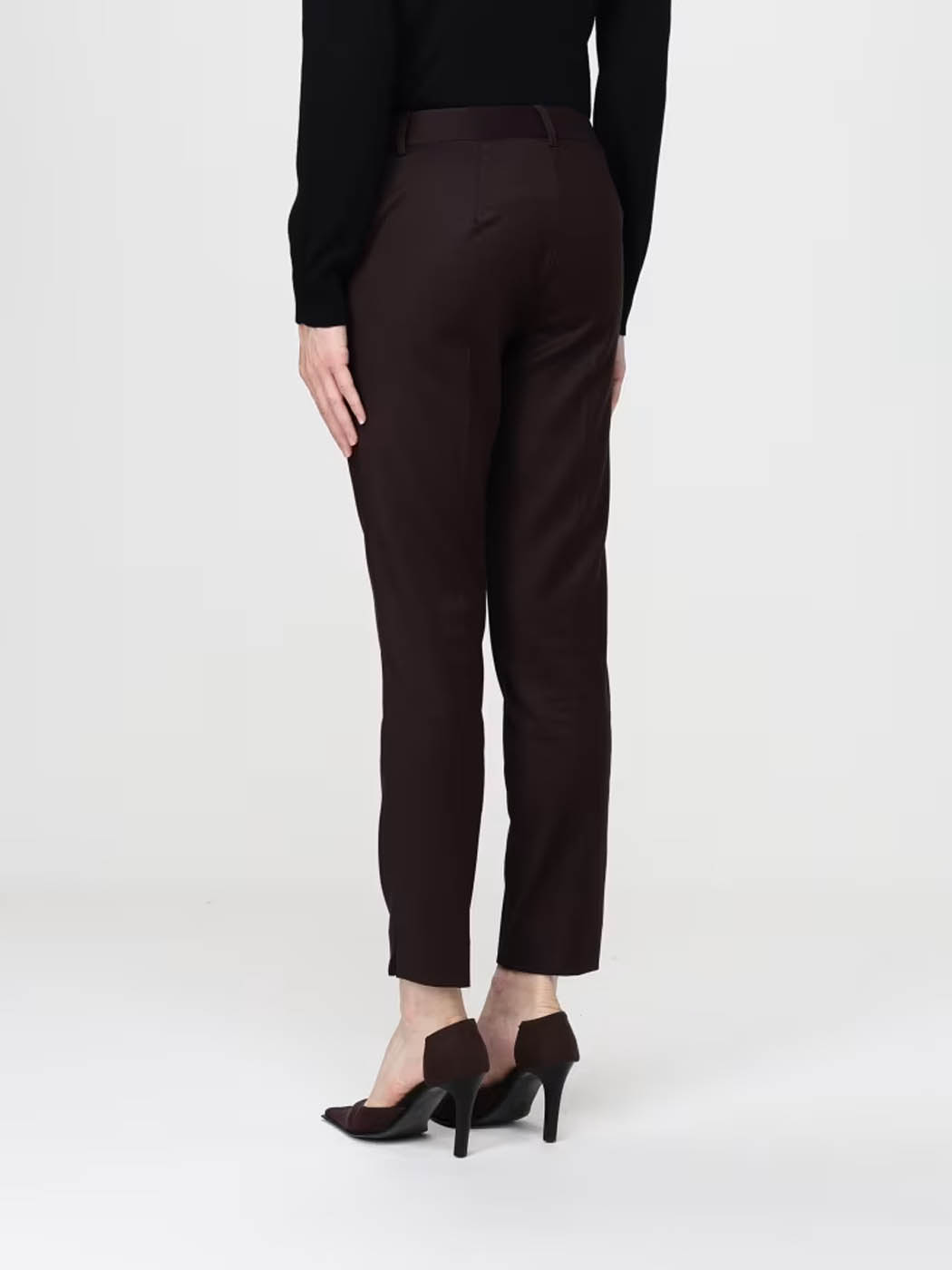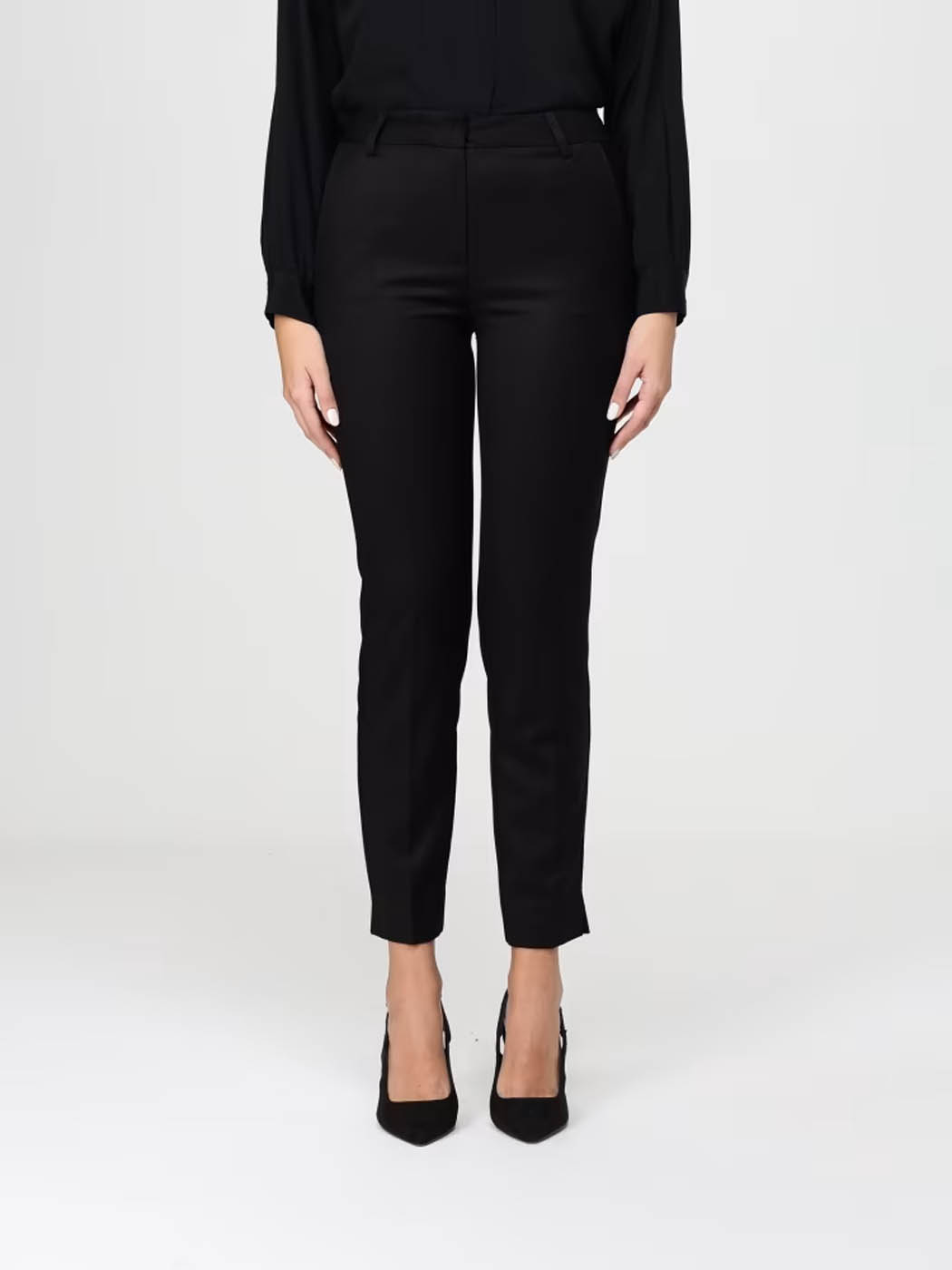 Pantalone a sigaretta in pettinato confort. Spacco laterale sul fondo e tasche laterali sulla cucitura. Chiusura frontale con cerniera, bottone interno e gancio.