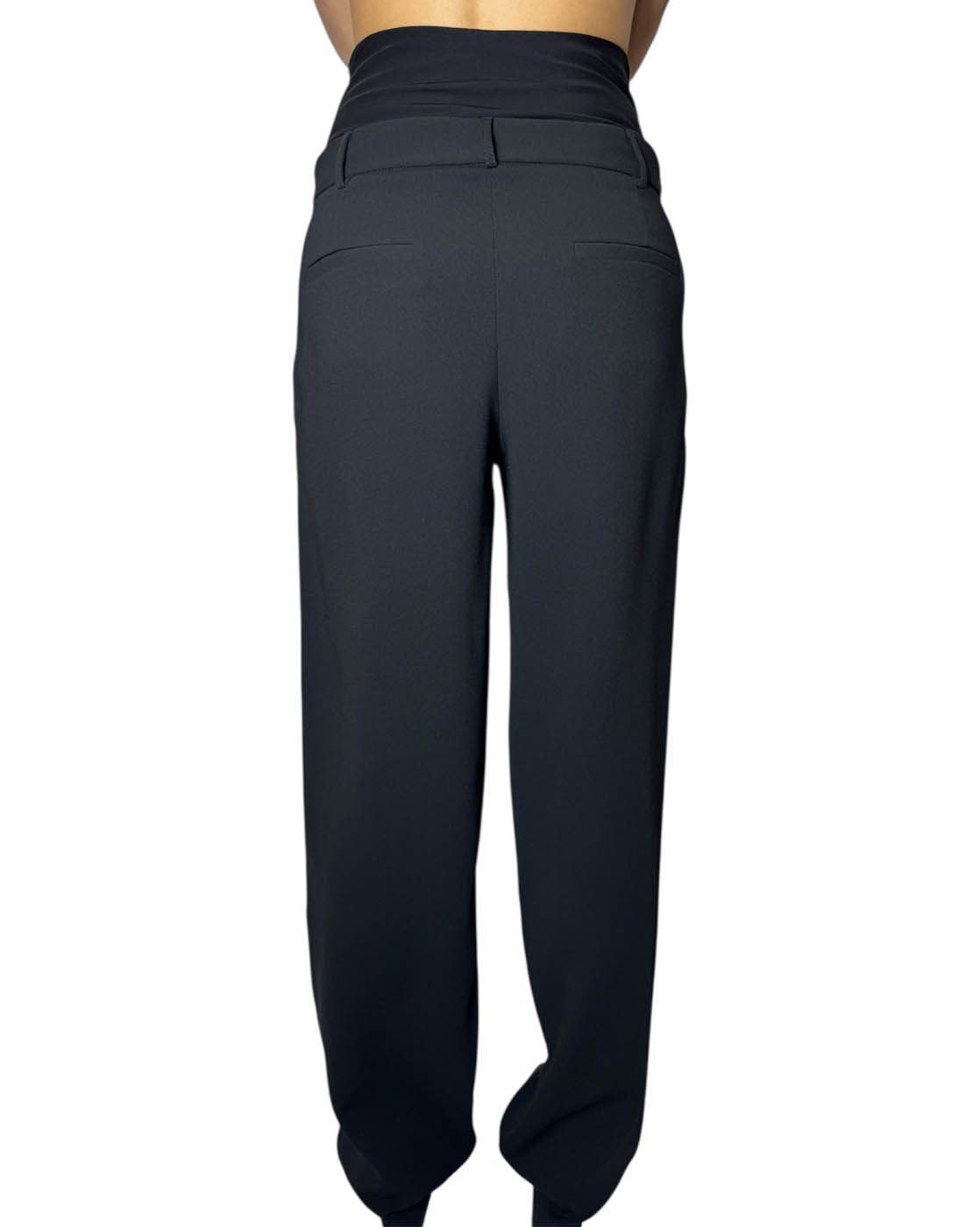 Pantaloni eleganti in enver satin con baschina. Chiusura con zip invisibile laterale. Pantalone dritto con passanti in vita, chiusura con gancio e zip. Tasche a filetto sul dietro.
