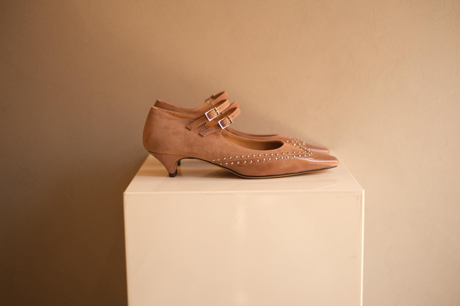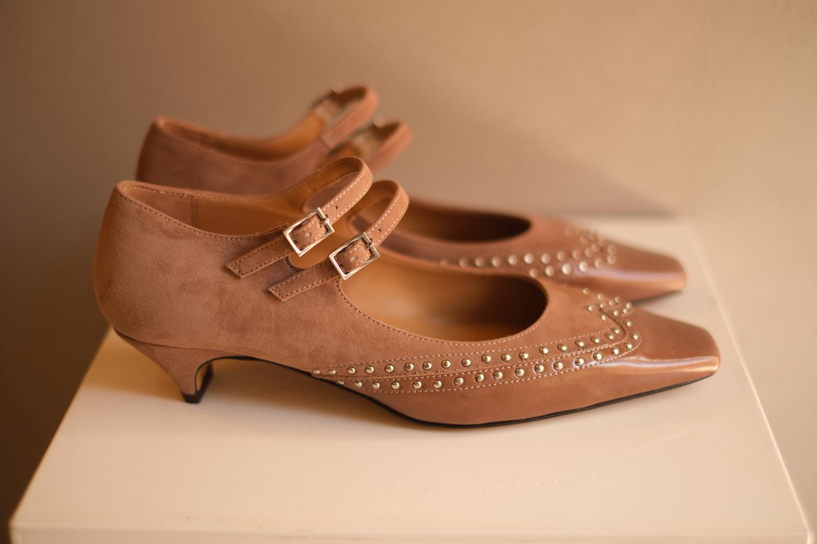 Decolletè in pelle e camoscio con borchie, tacco 5 cm