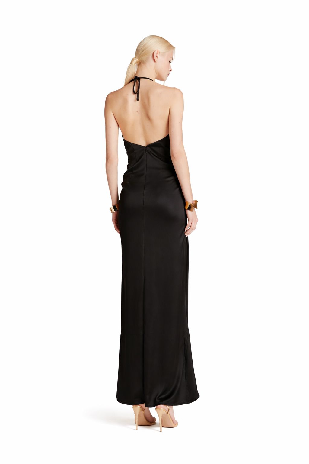 Abito in raso lungo con scollo profondo, placca in metallo e bracciali oro
