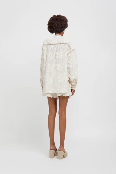 Camicia ampia in mussola lavorata 100% cotone, fit oversize con collo coreano.