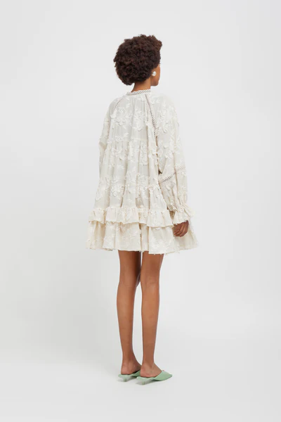 Abito corto a grembiule in mussola ricamata 100% cotone con colletto coreano.