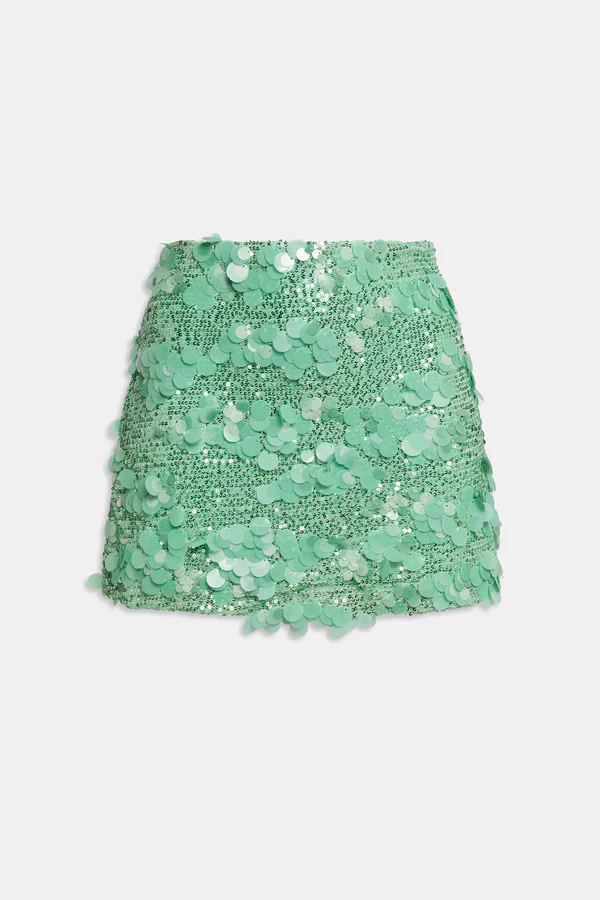 Minigonna in tessuto paillettes con fodera in crepe e zip laterale invisibile.