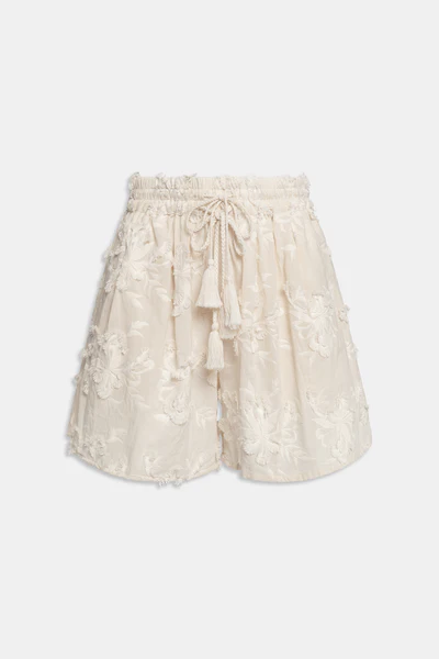 Pantaloncino a farfalla in mussola di cotone ricamata con elastico in vita.
