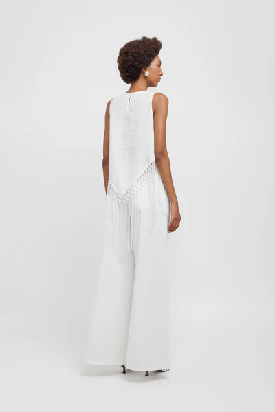 Top smanicato in 100% lino naturale con applicazione di maxi frange.