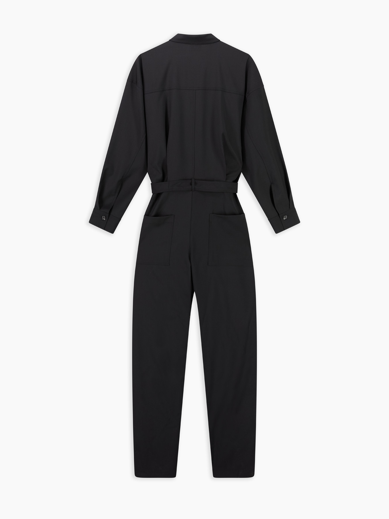 tuta in tela fresco di lana, cintura in vita in suo tessuto, polsi e collo a camicia, tasche con patta sul davanti, chiusura centrale con bottoni, due tasche applicate dietro, stretta al fondo.